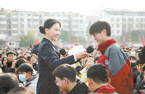 1月5日,江苏省邳州市检察院检察官走进校园开展普法宣传活动,通过与学生现场互动的形式,将防治校园欺凌、防范网络诈骗等法治知识送到青少年身边,筑牢校园安全防线。