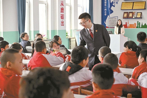 近日,吉林省长春新区检察院未检干警把法治教育延伸到乡村学校和留守儿童家庭,用自创的“小明的烦恼”法治故事,向同学们讲述如何预防和化解发生在身边的法律问题,以检察温情呵护未成年人成长。图为检察官在某乡村小学与同学们交流。