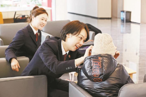 2月9日,在浙江省嘉兴市儿童福利院,南湖区检察院检察官细心地为浩浩戴上帽子。