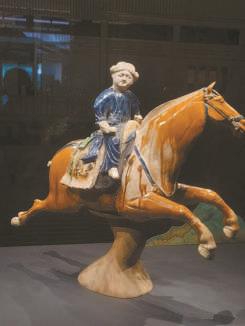唐代是马文化艺术表现的巅峰时期,各种艺术品层出不穷。这匹三彩腾空马于1966年出土于陕西省西安市莲湖区的一座唐墓,全长52厘米,通高38厘米,由胡人骑手和飞奔的马两部分组成,釉色生动,造型动感,是西安博物院的镇馆之宝,更是具有代表性的丝路文物。