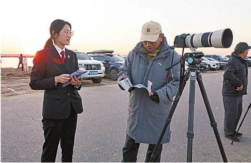 检察官向前来观鸟的游客讲解鸟类保护相关法律知识。