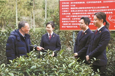 福建省武夷山市检察院检察官在茶园听取江元勋代表(左一)对生态保护和促进茶产业发展的意见建议。