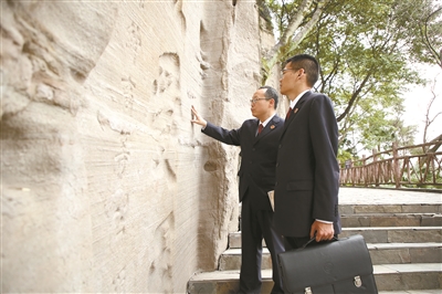 近日,重庆市渝中区检察院检察官来到佛图关古道,对邻崖分布的南宋题刻、清代碑记及民国摩崖石刻开展文物修复情况“回头看”,以跟踪问效守护巴渝千年文脉。