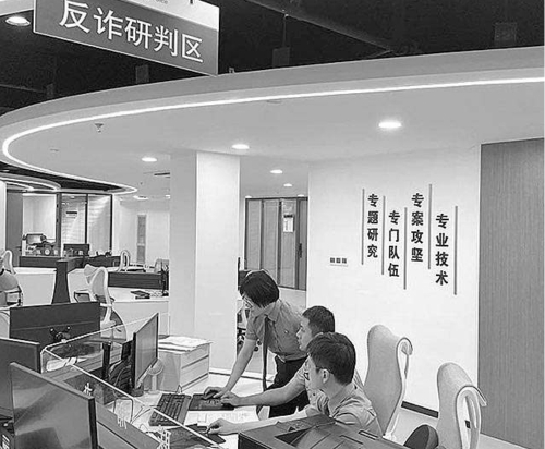 2023年5月,余杭区检察院检察官在公安机关反诈中心与公安民警进行案件分析研判。